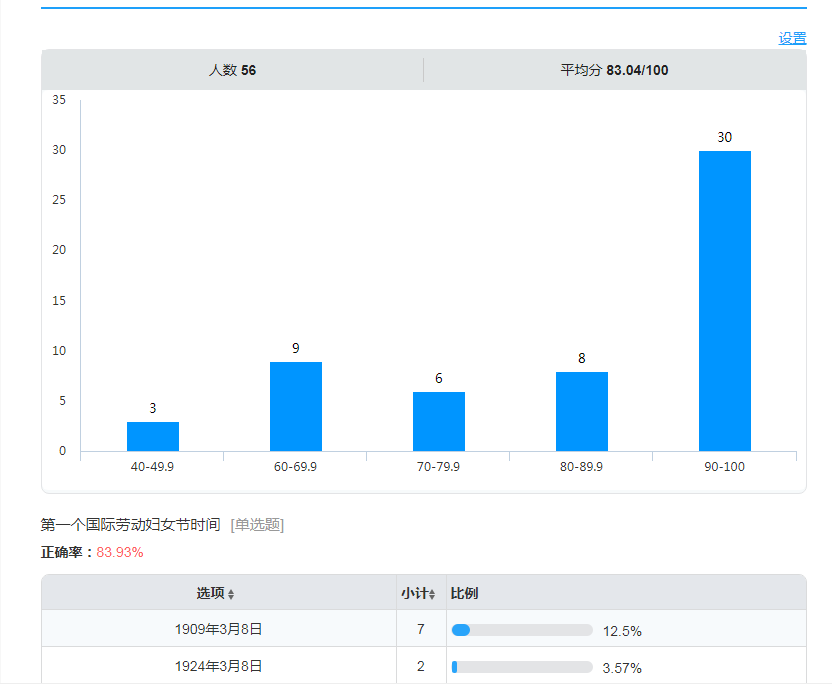 有奖知识问答(线上)活动以手机问卷星答题链接形式开展,学院共有56名女教工全部参加该项活动,答题平均分数高达83.04,学院精心为每一位参与女教工发放活动纪念品一份。