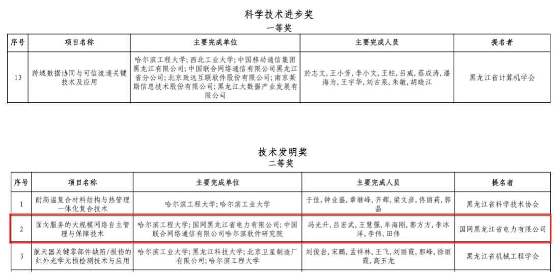 矢志耕耘,喜撷硕果!8月30日,黑龙江省科技厅发布了《关于2023年度黑龙江省科学技术奖获奖名单的公告》,学院荣获黑龙江省科学技术奖2项。其中,於志文教授主持完成的“跨域数据协同与可信流通关键技术及应用”项目荣获科学技术进步奖一等奖,是亚博官网唯一获评的科学技术进步一等奖。冯光升教授主持完成的“面向服务的大规模网络自主管理与保障技术”项目荣获技术发明奖二等奖。