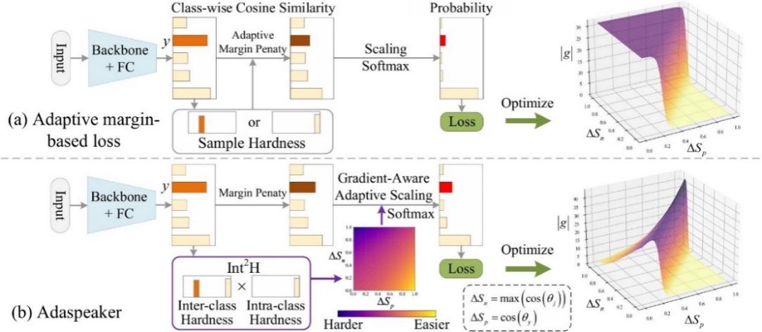 论文的研究内容聚焦于说话人识别,是多媒体音频信号处理的重要研究方向。为了提高说话人特征表示的判别性学习,当前先进的损失函数使用自适应边距策略强调重要的音频样本,虽然取得了性能的提升,但这类损失难以建立硬样本挖掘与梯度更新的显著关联。因此,该论文提出了一种新颖的损失函数,首先联合样本的类间难度与类内难度有效建模音频样本的难度系数,随后该系数用于自适应尺度化音频样本的余弦相似度预测以建立硬样本挖掘与梯度更新的显著关联。